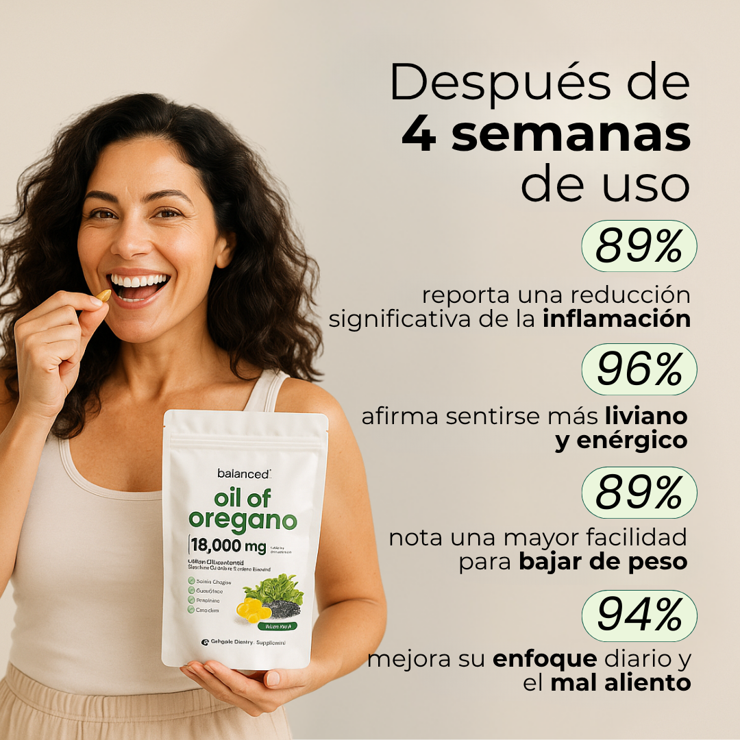 El aceite de orégano contiene carvacrol, un activo natural que actúa sobre las membranas de bacterias y hongos dañinos eliminándolos por completo. El resultado: una sensación de ligereza y un abdomen mas plano. Ya no tenes que matarte en el gym. Porque cuando el cuerpo se limpia desde adentro… todo empieza se vuelve mas fácil.