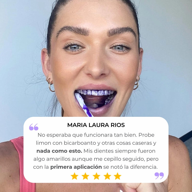 Nuestro suero utiliza la tecnología de corrección de color V34 para neutralizar los tonos amarillos, revelando instantáneamente una sonrisa más brillante y deslumbrante. ¡Es la magia púrpura para tus dientes!